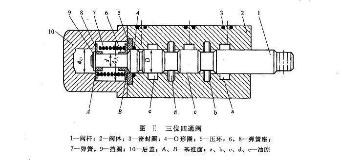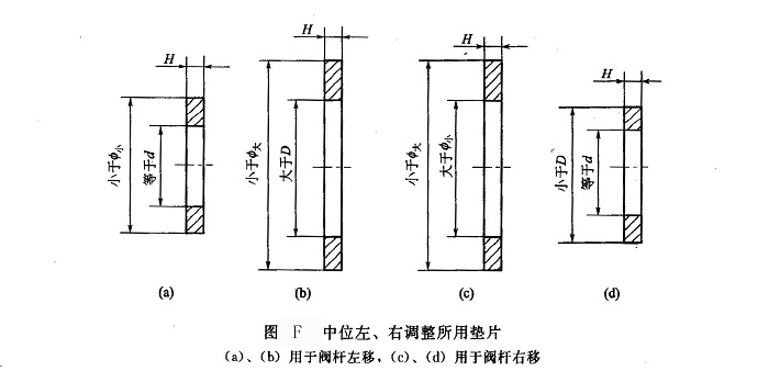 ②方法Ⅱ 若認為采用方法I不便,可采用加圓墊片的方法確定閥桿倒角的準確位置(見圖F)。預先加工出厚度分別為0.5mm和0.8mm的兩組圓墊片,每組一大一小共兩個,大墊片用來移動閥桿,小墊片用來防止閥桿竄動。用于左移的大墊片內(nèi)徑略大于閥桿直徑D,外徑略小于或等于圖E中后蓋10的內(nèi)徑廬大;小墊片外徑略小于圖F中后蓋10的里端內(nèi)徑聲小,內(nèi)徑等于或略大于閥桿前端直徑d。如欲將閥桿中立位置左移,就將大墊片墊在彈簧座B基準面后面,小墊片墊在彈簧座基準面A后面(這樣,閥桿的中立位置就會左移,而閥桿仍能保持左右沒有自由竄動量,如果只墊大墊片,閥桿就會有自由竄動量);如欲將閥桿向右移動,就將大墊片墊在彈簧座基準面A后面,將小墊片墊在彈簧座基準面B后面,這樣,閥桿的中立位置就會向右移動。每次加裝墊片后(左、右移動各有2種厚度的墊片,共有4種狀態(tài))均須裝機試驗,最多4次就能找出閥桿上油槽阻礙低壓回油處(對應a腔或b腔);然后,對阻擋回油的軸肩處進行如同方法工那樣的倒角處理即可,但倒角后切不可忘記將所加的墊片取下來;如果加墊片后,閥桿的動作正常,可暫時使用。