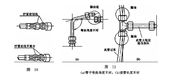 (2)由于管子的彎曲角度不對[見圖11(a)],以及接管長度不對[見圖11(b)],管接頭擴口處很難密合,造成泄漏,其泄漏部位如圖所示。為保證不漏,應使彎曲角度正確和控制接管長度適度(不能過長或過短)。