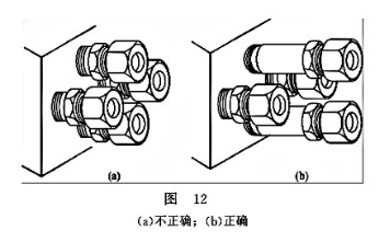 (3)接頭位置靠得太近,不能擰緊,有干涉。在若干個接頭靠近在一起時,若采用圖12(a)所示的排列,接頭之間困靠得太近,扳手因活動空間不夠而不能擰緊,造成漏油。解決辦法是拉開管接頭之間的距離,不行的話可按圖12(b)中的方法解決,可方便擰緊,便于維修。