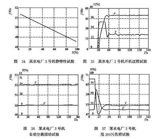 圖34~圖38給出的是幾個典型的現場試驗結果曲線,從中可以看出,不但調節(jié)過程性能指標完全滿足有關規(guī)程要求,其動態(tài)調節(jié)時的總體過渡過程趨勢也很令人滿意。