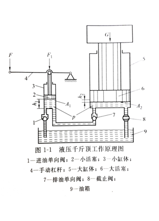 根據(jù)流體力學(xué)中的帕斯卡定律 “在密閉容器內(nèi),施加于路上液體上的壓力將以等值同時(shí)傳到液體各點(diǎn)”,若要頂起重物,則在小活塞下腔就必須產(chǎn)生一個(gè)等值的壓力p,即小活塞上施加的力F1,為