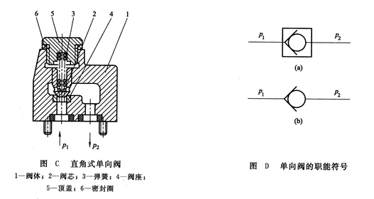 (1)結(jié)構(gòu)及工作原理 單向閥按其結(jié)構(gòu)的不同,有鋼球密封式直通單向閥(圖A)、錐閥芯密封式直通單向閥(圖B)和直角式單向閥(圖C)三種形式。