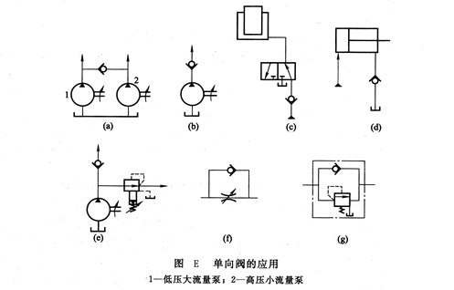⑦與其他控制閥并聯(lián)使用,使之在單方向上起作用。如圖E(f)所示,單向閥與節(jié)流閥并聯(lián)使用,則實現(xiàn)只在單方向起節(jié)流或調(diào)速作用。又如圖E(g)所示,單向閥與順序閥并聯(lián)使用,組成組合閥。