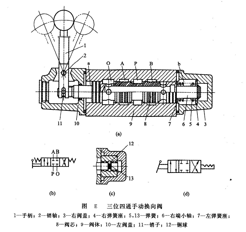 圖E (c)所示為鋼球定位式三位四通換向閥的定位原理:當(dāng)用手柄撥動閥芯時,閥芯可以借助彈簧13和鋼球12保持在左、中、右任何一個位置上。這種結(jié)構(gòu)應(yīng)用予機(jī)床、液壓泵、壓機(jī)、船舶及工程機(jī)械等。圖E (d)為其職能符號。