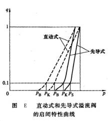 (2)啟閉特性(黏滯特性) 啟閉特性指溢流閥在穩(wěn)定情況下從開(kāi)啟到閉合的過(guò)程中,被控壓力和通過(guò)溢流閥的溢流量之間的關(guān)系。它是衡量溢流閥定壓精度的一個(gè)重要指標(biāo),一般用溢流閥處于額定流量、調(diào)定壓力ps時(shí),開(kāi)始溢流的開(kāi)啟壓力pK和停止溢流的閉合壓力pB分別與ps的百分比來(lái)衡量。前者稱(chēng)開(kāi)啟比,后者稱(chēng)閉合比。顯然上述兩個(gè)百分比越大,開(kāi)啟壓力和閉合壓力越接近調(diào)定壓力,溢流閥的啟閉特性就越好,一般規(guī)定開(kāi)啟比應(yīng)不小于90%,閉合比應(yīng)不小于85%。直動(dòng)式和先導(dǎo)式溢流閥的啟閉特性曲線如圖E所示。