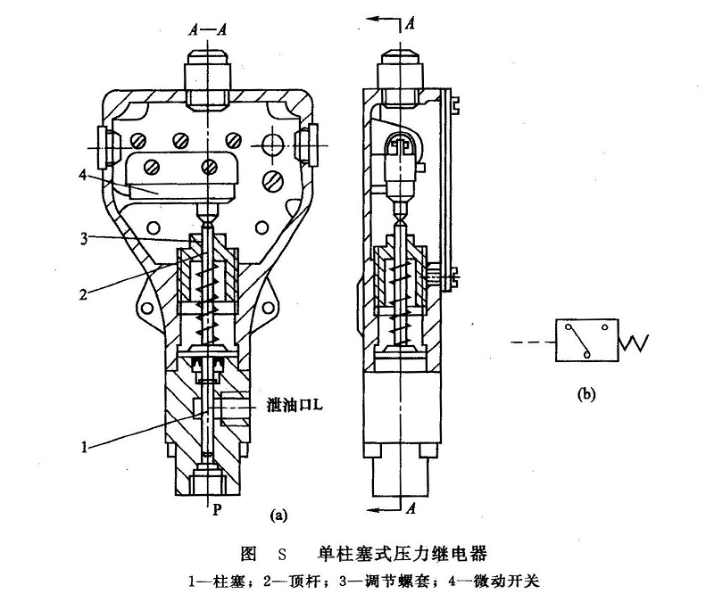 結(jié)構(gòu)與工作原理 圖S所示為單柱塞式壓力繼電器的結(jié)構(gòu)及其職能符號(hào)??刂瓶?span lang="EN-US">P和液壓系統(tǒng)相連,當(dāng)系統(tǒng)壓力達(dá)到調(diào)定值時(shí),作用于柱塞1上的液壓力克服彈簧力,頂桿2上推,使微動(dòng)開關(guān)4的觸點(diǎn)閉合,發(fā)出電信號(hào);當(dāng)系統(tǒng)壓力下降,彈簧力將柱塞下推,使微動(dòng)開關(guān)的觸點(diǎn)斷開,電信號(hào)消失。