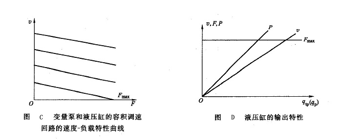 根據(jù)式(7-18)選取不同的qtp值作圖,可得一組平行曲線即速度一負(fù)載特性曲線,如圖C所示。由于變量泵的泄漏,使得活塞速度隨著負(fù)載的增加而明顯下降,因此這種調(diào)速回路在低速下的承載能力很差。