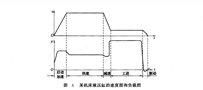 (3)工作負(fù)載圖對(duì)于復(fù)雜的液壓系統(tǒng),如果有若干個(gè)執(zhí)行元件同時(shí)或分別完成不同的工作循環(huán),則有必要按上述各階段計(jì)算總的負(fù)載力,并根據(jù)上述各階段的總負(fù)載力和經(jīng)過(guò)的工作時(shí)間t(或位移s),按相同的坐標(biāo)繪制液壓缸的負(fù)載一時(shí)間( F-t)或負(fù)載一位移(F-s)圖。如圖A所示為一液壓缸的速度圖和負(fù)載圖。