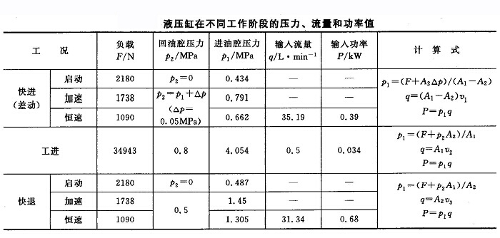 在鉆孔加工時,液壓缸回油路上必須有背壓p2,以防被鉆通時滑臺突然前沖。可取p2=0.8MPa。快進時液壓缸雖然作差動連接,但是由于油管中有壓降△p存在,有桿腔的壓力必須大于無桿腔,估算時可取△p約為0.5MPa??焱藭r回油腔中有背壓,這時p2也可按0.5MPa估算。