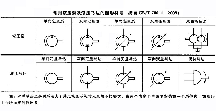 采用GB/T 786. 1-2009繪制的常用液壓泵及液壓馬達圖形符號見下表,圖形符號意義如下。