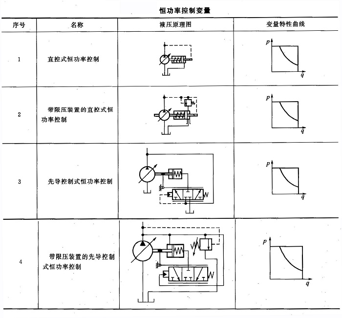 (2)變量控制方式及其特性 通過(guò)改變液壓泵的排量V(幾何參數(shù))調(diào)節(jié)流量時(shí),在泵的轉(zhuǎn)速恒定時(shí),泵的排出流量發(fā)生變化,可形成流量控制泵。由于泵的出口總有阻力負(fù)載存在,故泵出口流量的變化將影響泵的出口壓力。有時(shí)控制泵的排量還能控制泵的工作壓力,形成壓力控制變量泵??梢娮兞靠刂品绞椒N類繁多。工程實(shí)際中,軸向柱塞泵在結(jié)構(gòu)上最適宜安裝各種變量控制機(jī)構(gòu),故變量控制方式最多。葉片泵也可安裝若干變量控制機(jī)構(gòu)。一些典型的變量控制方式見下表。
