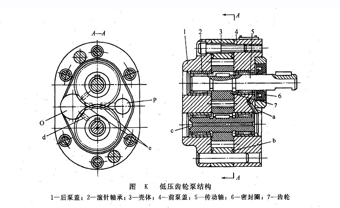 ①低壓齒輪泵 該泵為泵蓋一殼體一泵蓋三片式結構(圖K)。裝在殼體3中的一對齒輪由傳動軸5驅動。在殼體3的左右斷面各銑有卸荷槽b,經殼體端面泄漏的油液經卸荷槽b流回吸油腔,以降低殼體與端蓋結合面上的油壓對軸承造成的軸向推力,減小螺釘載荷。在泵前、后端蓋上的困油卸荷槽e可消除泵工作時的困油問題??椎?span lang="EN-US">a、c、d可將軸向泄漏并潤滑軸承的油液送回到吸油腔,使傳動軸的密封圈6處于低壓,因而不必設置單獨的外泄漏油管。