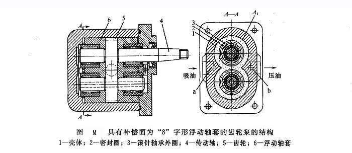 ②高壓齒輪泵 圖M所示為具有“8”字形浮動軸套的齒輪泵結構。齒輪5由帶圓錐軸伸的傳動軸4驅動,浮動軸套6的“8’’字形補償面積A1由殼體1和兩個與齒輪同心的密封圈2圍成,壓力油自高壓引油孔b引入并作用在“8”字形補償面積A1上,泄漏油孔a可把內部的泄漏油引入吸油腔。在泵啟動或空載而油壓還未建立時,0形密封圈2可以使浮動軸套6與齒輪5間產生足夠的、必要的預緊接觸力。這種補償裝置結構簡單。但由于補償面積的對稱中心與主、從動齒輪端面對稱中心重合,液壓壓緊力(即補償液壓力的合力)的作用線通過浮動軸套的中心,而軸套另一側液壓反推力的合力作用線離開軸套中心向壓油腔偏離,這兩個力對軸套就形成了力偶。該力偶易使軸套傾斜,這不僅會加大端面間隙、增加泄漏,還會使軸套浮動不靈活及產生局部磨損。為了克服上述缺點,通常要加大軸套與殼體的配合長度并提高加工精度。