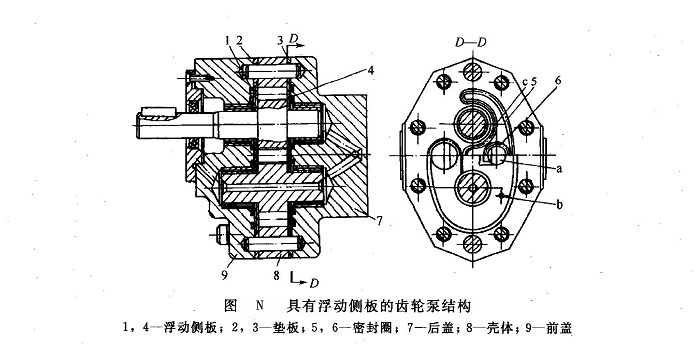 圖N所示為采用浮動側板實現(xiàn)軸向間隙自動補償?shù)母邏糊X輪泵結構。該泵在殼體8與前蓋9、后蓋7之間增設了墊板2和3、浮動側板1和4(墊板比浮動側板厚0.2mm)以及密封圈5和6(嵌在泵蓋內側排油區(qū)位置)。工作時,壓油區(qū)的一部分壓力油通過浮動側板上的兩個小孔b作用在密封圈5和6包圍的區(qū)域內,反向推動浮動側板向內微量移動,從而使軸向間隙保持在0.03~0.04mm之間。這樣可控制700%~80%以上的泄漏量。故此類泵容積效率較高,適用于高壓齒輪泵。國產CB-FX系列中高壓齒輪泵即屬于此類泵,其額定壓力達到20MPa。