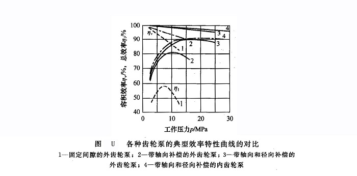 (4)效率各種結構形式的齒輪泵的典型效率特性曲線如圖U所示??梢钥闯觯瑤в虚g隙補償措施的齒輪泵的性能明顯優(yōu)于固定間隙型,而內嚙合齒輪泵的性能又優(yōu)于外嚙合齒輪泵。