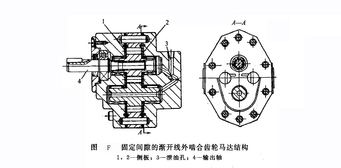 ①固定間隙的漸開線外嚙合齒輪馬達(dá) 圖F所示為固定間隙的漸開線外嚙合齒輪馬達(dá)結(jié)構(gòu)。齒輪兩側(cè)的側(cè)板用優(yōu)質(zhì)碳素鋼08F表面燒結(jié)0.5~0.7mm厚的磷青銅制成。該側(cè)板只起耐磨作用,沒有端面間隙補(bǔ)償作用。采用固定間隙可以減小摩擦轉(zhuǎn)矩,改善啟動性能,但容積效率較低。國產(chǎn)CM-F型齒輪馬達(dá)即為此種結(jié)構(gòu),其額定壓力為14MPa,排量為11~40mL/r,轉(zhuǎn)矩為20~70N·m,轉(zhuǎn)速為1900~2400r/min。