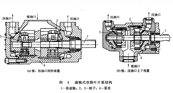 ⑤雙聯(lián)葉片泵幾乎所有形式的單葉片泵都可以組合成為雙聯(lián)泵結(jié)構(gòu),但組合形式又有所區(qū)別。常見的結(jié)構(gòu)組合形式有通軸式和法蘭式兩種。圖W所示為通軸式雙聯(lián)葉片泵結(jié)構(gòu)。在一個泵殼4內(nèi)的一根傳動軸l的兩端,分別裝有兩個轉(zhuǎn)子2和3,形成排量不同的大小泵且兩者共用一個吸油口,但壓油口分開[圖W(a)的吸、壓油口均布置在泵殼的上方;而圖W(b)的吸油口布置在泵殼的下方,壓油口布置在泵殼的上方]。法蘭式是將兩臺獨立單泵通過連接法蘭直接組合成雙聯(lián)泵。