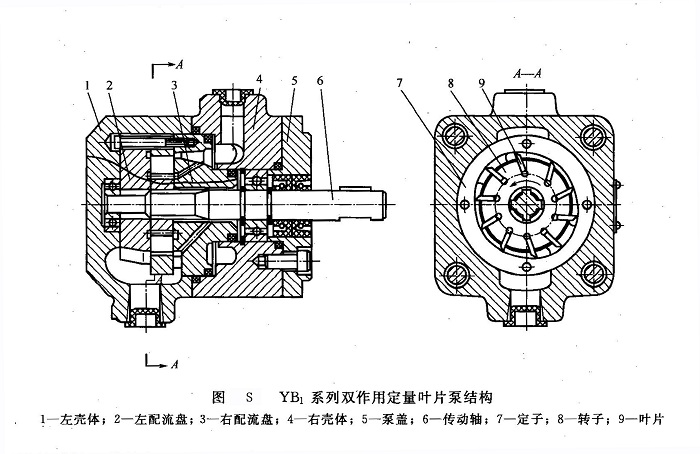 ①YB1系列雙作用定量葉片泵該系列雙作用葉片泵是在我國最早引進(jìn)前蘇聯(lián)HY02技術(shù)生產(chǎn)的YB1型葉片泵基礎(chǔ)上經(jīng)改進(jìn)設(shè)計而成的液壓泵,其結(jié)構(gòu)如圖S所示。該系列泵由左殼體1、右殼體4、轉(zhuǎn)子8、葉片9、定子7、左配流盤2、右配流盤3、泵蓋5及傳動軸6等構(gòu)件組成。右配油盤上的O形密封圈可有效防止軸端泄漏,密封可靠。泵的左、右配流盤及定子、轉(zhuǎn)子和葉片可先組裝成一個部件(簡稱為泵芯)裝入殼體。此組合部件由兩個緊固螺釘提供初始預(yù)緊力,以便泵啟動時能建立起壓力。建立壓力后,配油盤和定子組件靠右配油盤右側(cè)的液壓力壓緊,壓緊力隨壓力增大而增大,自動補償軸向間隙,保證泵有較高的容積效率。YB1系列葉片泵可反轉(zhuǎn),任意兩個不同排量的單泵可組成雙聯(lián)泵,單、雙聯(lián)泵共有119個不同規(guī)格,單泵最大排量為100mL/r,額定壓力為7MPa。結(jié)構(gòu)簡單,壓力脈動和噪聲小,壽命長。YB-D系列葉片泵的結(jié)構(gòu)基本與YB1系列泵相同,只是其定子進(jìn)行了氮化處理,殼體壁厚加大,額定壓力增加到1OMPa。