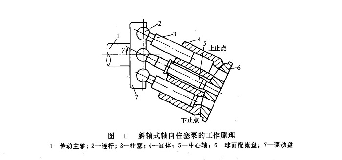 如圖L所示,斜軸式軸向柱塞泵由傳動主軸1、連桿2、柱塞3、缸體4、中心軸5、球面配流盤6及殼體和后蓋(圖中未畫出)等組成。缸體與傳動主軸軸線相對成一傾斜角γ,軸端部的驅(qū)動盤7用萬向鉸鏈、連桿與缸體中的每個柱塞相連。當(dāng)原動機帶動泵的傳動主軸旋轉(zhuǎn)時,由連桿一柱塞副交替“撥動”缸體在具有腰形窗口的配流盤上作滑動旋轉(zhuǎn)。由于主軸和缸體軸線有一夾角,柱塞由下止點向上止點方向運動時便獲得一個吸油行程,通過吸油口及配流盤的腰形窗口將油液吸入缸體。當(dāng)柱塞由上止點向下止點運動時,便產(chǎn)生壓油行程,將充滿缸體孔里的油液經(jīng)配流盤和出油口排出。從驅(qū)動軸方向看,如果泵是順時針方向旋轉(zhuǎn)(右轉(zhuǎn)),則吸油口在后蓋的左側(cè),而壓油口在后蓋的右側(cè)。仍是從驅(qū)動軸方向看,如果驅(qū)動軸逆時針方向旋轉(zhuǎn)(左轉(zhuǎn)),則吸油口在后蓋的右側(cè),而壓油口在后蓋的左側(cè)。