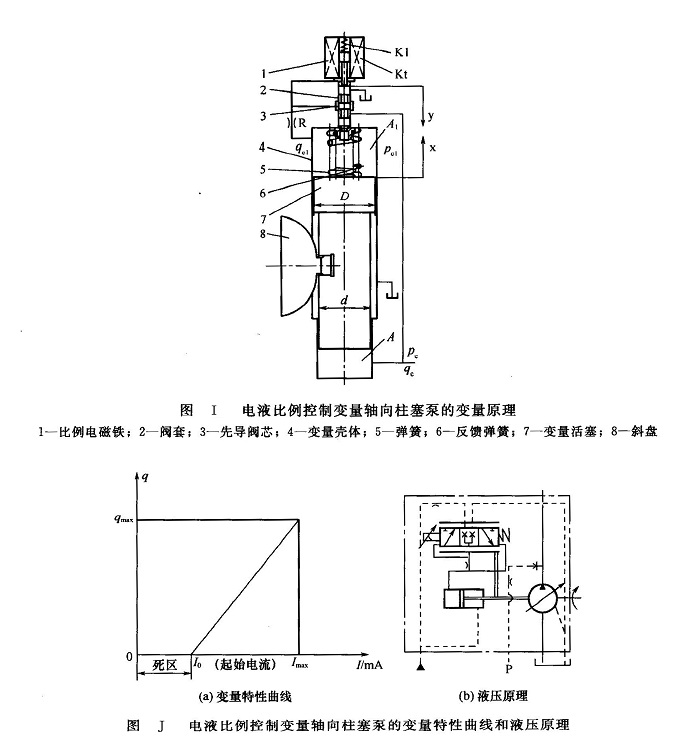 圖H所示為BCY14-1型電液比例控制變量軸向柱塞泵結(jié)構(gòu),其主體部分由傳動軸1帶動缸體20旋轉(zhuǎn),使均勻分布在缸體上的7個柱塞繞傳動軸中心線轉(zhuǎn)動,通過中心彈簧6將柱滑組件中的滑履18壓在斜盤的斜面上。從而柱塞隨著缸體的旋轉(zhuǎn)而作往復(fù)運動,完成吸油和壓油動作。其變量機構(gòu)采用了比例電磁鐵和外控油壓控制,并基于“流量位移力反饋”原理工作。通過改變輸入比例電磁鐵11的電流大小來改變泵的流量,輸入電流與泵的流量成比例關(guān)系,其電液比例控制變量原理如圖I所示。當(dāng)比例電磁鐵1輸入電流為零時,控制滑閥的先導(dǎo)閥芯3在反饋彈簧6的作用下被推至上端,此時壓力為pc、流量為qc的外控油液進入變量活塞7的上、下兩腔,由于上腔面積A1大于下腔面積A,故變量活塞被推向最下端位置,斜盤8的偏角為零,泵的排量也為零。當(dāng)比例電磁鐵的輸入電流增大時,先導(dǎo)閥芯3受比例電磁鐵推力的推動而下移,從而使滑閥的上閥口打開,變量活塞7上腔通過液阻R及閥的控制邊與回油腔接通,上腔壓力降低,變量活塞上移,斜盤偏角增大,泵的排量也隨之增大,同時變量活塞的移動又通過壓縮反饋彈簧作用在滑閥閥芯上,將滑閥閥芯推到平衡位置,變量活塞即維持在某一確定的平衡位置上,泵的排量也維持在某一定值。反之,當(dāng)輸入電流減小時,滑閥閥芯在反饋彈簧的作用下上移,使通向回油腔的閥口減小,進入上腔的閥口增大,由此上腔壓力pc1增大,變量活塞向下移動,直至電磁鐵推力等于反饋彈簧力時,滑閥閥芯又回到平衡位置,使pclA1=pcA,變量活塞又在一個新的位置上平衡。在輸入電流不變的情況下,若由于負(fù)載或其他干擾原因引起變量活塞上移或下移,則變量活塞的該位移變化量.通過反饋彈簧作用在滑閥閥芯上,改變滑閥的開口,使變量活塞的上腔壓力升高或降低,以抵抗負(fù)載的變化,最終使變量活塞回到與輸入電流相對應(yīng)的位置上,即保持排量不變。由此可見,該比例變量泵可在輸入電流的作用下,對排量實現(xiàn)比例控制且有很強的抗負(fù)載干擾能力。圖J給出了泵的變量特性曲線和液壓原理。