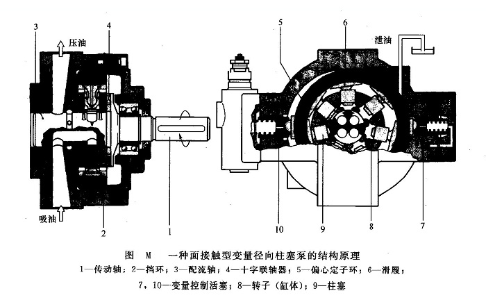 ②面接觸型徑向柱塞泵 圖M所示為一種面接觸型變量徑向柱塞泵的結構原理。傳動軸1通過十字聯(lián)軸器4帶動徑向力平衡的星形轉子(缸體)8旋轉。轉子支承在配流軸3上。裝在轉子孔內(nèi)的柱塞9通過靜壓平衡的滑履6緊貼在偏心定子環(huán)5上。柱塞與滑履為球鉸連接,并由卡環(huán)鎖定。由兩個擋環(huán)2將滑履約束在偏心定子環(huán)內(nèi),運轉時由離心力和液壓力將滑履壓向偏心定子環(huán)。當缸體旋轉時由于偏心定子環(huán)的作用,柱塞就形成往復運動,它的行程為偏心定子環(huán)偏心距的2倍。定子環(huán)的偏心位置可由在泵體上徑向相對位置的變量控制活塞7、10調(diào)節(jié)。吸油和壓油通過泵體和配流軸上的流道,并可由配流軸上的進、出油口控制。由于在泵內(nèi)柱塞與定子環(huán)內(nèi)表面通過上端為圓弧面的滑履緊貼(面接觸),且產(chǎn)生的作用于內(nèi)表面的液壓力是完全靜壓平衡的,支承傳動軸的滾動軸承只受到外力作用,所以,泵的壽命較長。德國博世(BOSCH)公司生產(chǎn)的RKP型徑向柱塞泵即為此種結構,其最高工作壓力為38.5MPa,流量范圍為16~90mL/r,最高轉速為3500r/min。