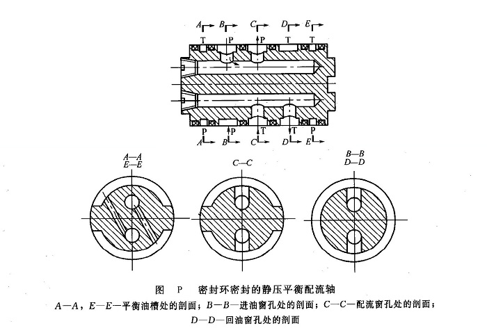 ③配流副 圖O所示馬達(dá)為軸配流。由于配流軸的一側(cè)為高壓腔,另一側(cè)為低壓腔,故配流軸工作過程受到很大的徑向力,此徑向力將配流軸推向一側(cè),而使另一側(cè)間隙加大,造成滑動(dòng)表面的磨損和泄漏量的增加,致使效率下降。為此,常采取開設(shè)對(duì)稱平衡油槽的措施以平衡徑向力。如圖P所示為采用密封環(huán)密封的靜壓平衡配流軸,正中的C-C窗孔是配流窗孔,B-B和D-D上的環(huán)形槽分別是進(jìn)油和回油窗孔,A-A和E-E是靜壓平衡半圓環(huán)形槽。假定各密封環(huán)分別放置在密封帶的正中。若進(jìn)、出油方向如圖P中箭頭所示,各孔標(biāo)有符號(hào)P的都是高壓腔,標(biāo)有符號(hào)T的都是低壓腔??梢姡?/span> B-B和D-D圓周方向的壓力都相同,沒有徑向力產(chǎn)生;C-C窗孔剖面的上腔與進(jìn)油口相通,是高壓側(cè),下腔與回油口相通,是低壓側(cè),因此使配流軸受到很大的徑向力。為了平衡這個(gè)徑向力,在配流軸兩端設(shè)置半圓環(huán)形平衡油槽A-A和E-E,使其上腔通高壓油,為了減小泄漏,各腔之間設(shè)有密封環(huán)。為了保證上、下兩側(cè)靜壓平衡,配油窗口和平衡油槽的相關(guān)尺寸應(yīng)滿足如下關(guān)系式: