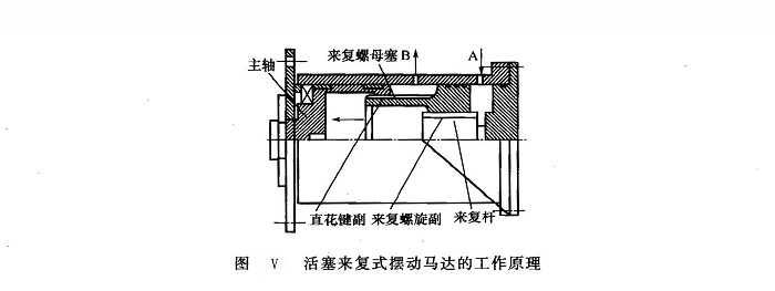 (6)活塞來(lái)復(fù)式擺動(dòng)馬達(dá)如圖V所示,在活塞來(lái)復(fù)式擺動(dòng)馬達(dá)中,當(dāng)壓力油從A口進(jìn)入推動(dòng)活塞向左作直線運(yùn)動(dòng)時(shí),B口排油。圖V中主軸固定,通過(guò)來(lái)復(fù)螺旋副迫使來(lái)復(fù)桿及與之固接的缸體旋轉(zhuǎn)。若B口進(jìn)油,A口排油,則缸體反轉(zhuǎn)。馬達(dá)轉(zhuǎn)角的大小取決于活塞行程。此種馬達(dá)的優(yōu)點(diǎn)是結(jié)構(gòu)緊湊,體積小,工作平穩(wěn)可靠,密封容易。缺點(diǎn)是加工成本較高。