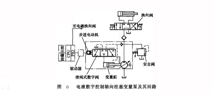 數(shù)字控制的液壓泵也由主體和變量機(jī)構(gòu)兩部分組成,其中變量機(jī)構(gòu)采用電液數(shù)字控制閥進(jìn)行控制和調(diào)節(jié)。圖O所示為一種滑閥式數(shù)字閥控制的軸向柱塞變量泵。其工作原理是:把執(zhí)行機(jī)構(gòu)的速度轉(zhuǎn)換成脈沖信號(hào),通過(guò)微機(jī)控制步進(jìn)電動(dòng)機(jī),經(jīng)機(jī)械轉(zhuǎn)換器將步進(jìn)電動(dòng)機(jī)的旋轉(zhuǎn)運(yùn)動(dòng)轉(zhuǎn)換為直線運(yùn)動(dòng),控制滑閥式數(shù)字閥的開(kāi)度及方向,從而控制進(jìn)入變量缸的壓力和方向,以實(shí)現(xiàn)對(duì)柱塞泵斜盤(pán)傾角的控制,獲得所需流量,泵的壓力自動(dòng)跟隨負(fù)載變化。因而這是一種既無(wú)壓力過(guò)剩、又無(wú)流量過(guò)剩的功率自適應(yīng)液壓泵。若泵的主油路被換向閥切斷或接至油箱,微機(jī)控制泵的斜盤(pán)處于零偏角位置;若系統(tǒng)出現(xiàn)過(guò)大負(fù)載,則可由安全閥進(jìn)行保護(hù)。