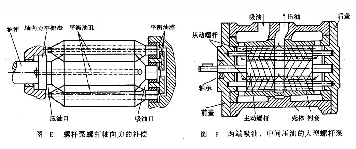 a.軸向力及其平衡在螺桿泵中,工作介質(zhì)的壓力沿軸線逐漸升高,這一壓差對螺桿副產(chǎn)生一個由壓油腔指向吸油腔的軸向推力,它將使螺桿間的摩擦力增大,加劇各配合表面的磨損并降低機械效率。常用的軸向力平衡措施如下(圖E)。