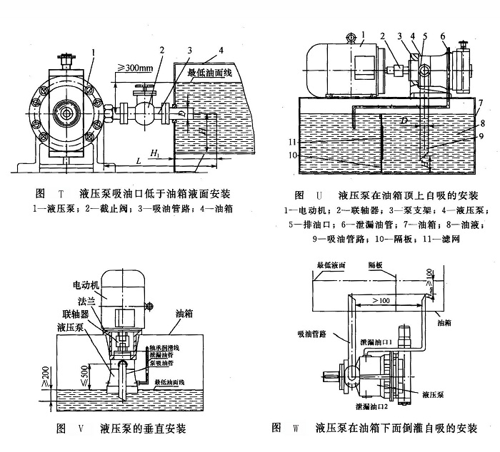 液壓泵安裝時(shí)應(yīng)盡可能使其處于油箱液面之下(圖T);對(duì)于流量<160L/min的泵,可以裝在油箱上自吸(圖U)。對(duì)于流量≥160L/min的柱塞泵,由于原動(dòng)機(jī)功率較大,建議不要安裝在油箱上,而采用倒灌自吸(圖W)。