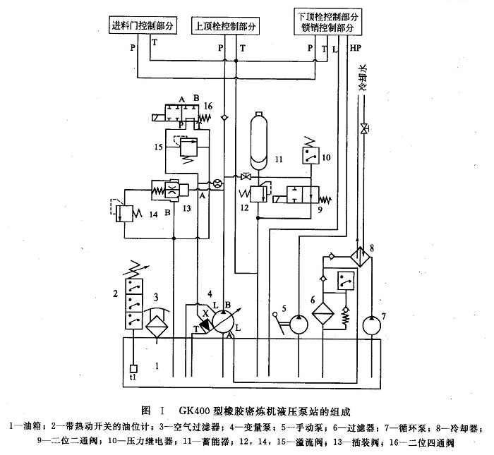 GK400型密煉機(jī)液壓系統(tǒng)可大體劃分為液壓泵站部分、上頂栓控制部分、下頂栓及鎖銷控制部分和加料斗控制部分四部分。