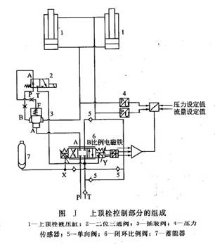在油溫調(diào)節(jié)和過濾方面,該泵站采用冷卻器和過濾器相串聯(lián)的方式,并以一個(gè)小泵作動力源,構(gòu)成一個(gè)獨(dú)立于主液壓系統(tǒng)的回路,以便不間斷地清除液壓油中的雜質(zhì),以滿足上頂栓控制部分中閉環(huán)比例閥對液壓油的要求,同時(shí)也使冷卻器不受液壓沖擊的影響。