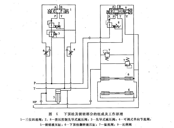 ③下頂栓及鎖銷控制部分的組成及工作原理 下頂栓及鎖銷控制部分的組成及工作原理圖如圖K所示。在下頂栓控制部分中,泄壓控制式減壓閥8控制著下頂栓翻轉(zhuǎn)時(shí)液壓缸的壓力;先導(dǎo)式比例閥的換向及開口程度由外部控制板設(shè)定的信號進(jìn)行比例控制,從而控制著下頂栓的運(yùn)動速度,防止下頂栓由于運(yùn)動過快而產(chǎn)生沖擊;溢流閥7主要起保護(hù)作用,防止由于過載而損壞下頂栓翻轉(zhuǎn)液壓缸。