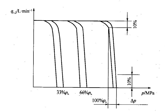 恒壓靜特性試驗:在最大排量、額定轉(zhuǎn)速下加載,繪制不同調(diào)定壓力下的流量一壓力特性鹽線如下圖所示