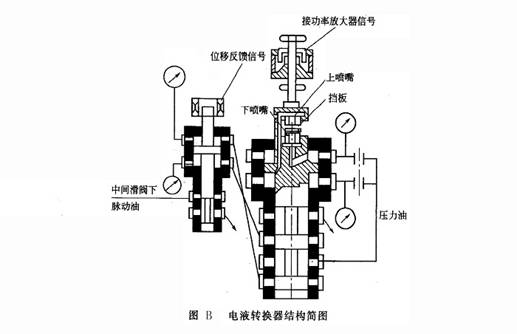 ①電液轉(zhuǎn)換器噴嘴堵塞 圖B為電液轉(zhuǎn)換器結(jié)構(gòu)簡圖。當(dāng)其處于平衡位置時,擋板位于上下兩噴嘴之間,且距上下兩噴嘴的距離相等,于是兩噴嘴的排油面積相等,與噴嘴相通的滑閥上下腔室的油壓也相等。此時.滑閥處于中間位置,活塞也處于穩(wěn)定位置,活塞控制中間滑閥脈動油的排油面積一定,油動機(jī)穩(wěn)定在相應(yīng)的行程位置。兩噴嘴直徑為φ4mm、間距為6mm,擋板厚度為5mm,則噴嘴與擋板間距為0.5mm。因此油流空隙很小,很容易被堵。若上噴嘴被堵塞,排油面積減小,則與上噴嘴相通的滑閥下腔油壓就會升高,使滑閥上移,打開活塞下腔的壓力油進(jìn)油口,活塞跟著上移,使控制中間滑閥脈動油的排油面積開大,從而使中間滑閥脈動油壓跌落,油動機(jī)會往關(guān)的方向走。當(dāng)堵塞面積相對較大時,即使電液轉(zhuǎn)換器活塞反饋也不能使滑閥達(dá)到新的平衡,則油動機(jī)就會一直關(guān)到零。