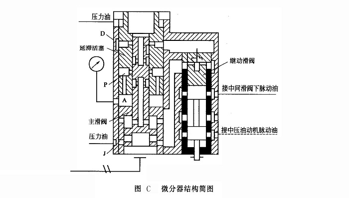 ④微分器誤動作圖C為微分器的結(jié)構(gòu)簡圖。該部件用于機(jī)組甩全負(fù)荷時接受調(diào)速器滑閥的油壓信號,加速調(diào)節(jié)汽閥(特別是中壓調(diào)節(jié)汽閥)的關(guān)閉,以限制機(jī)組轉(zhuǎn)速飛升的最大值。它的輸入信號是轉(zhuǎn)速的一次微分,當(dāng)主滑閥處于平衡狀態(tài)時,延滯活塞下腔室A內(nèi)的油壓為0.4MPa。此時主滑閥凸肩將延滯活塞上的油口P遮蓋,同時將油口D遮斷且有A=0.5mm的過封度。當(dāng)汽輪機(jī)轉(zhuǎn)速升高時,微分器主滑閥下脈動油壓下降,主滑閥向下移動,其結(jié)果是一方面開大油口J,增加壓力油的進(jìn)油量,使脈動油壓恢復(fù),主滑閥處于一個新的平衡位置;另一方面打開油口P,使油室A中的油排出,延滯活塞在其上下油壓差的作用下也隨之向下移動,直到油口P重新被遮蓋為止,延滯活塞也穩(wěn)定在一個新的平衡位置。如果汽輪機(jī)上升速度不快,主滑閥下脈動油壓下降的速度也不快,主滑閥移動的速度就比較慢,則延滯活塞與主滑閥的移動速度相差不大,二者之間拉開的距離很小,沒有超過0.5mm的過封度。這時,油口D不會被打開,繼動滑閥不會動作,其控制的中壓油動機(jī)及中間滑閥下的脈動油口也不會打開,油動機(jī)就不會全關(guān)。但是當(dāng)油動機(jī)突然甩去全負(fù)荷時,汽輪機(jī)轉(zhuǎn)速上升很快,微分器主滑閥下脈動油壓迅速下降,主滑閥也快速下降,此時,延滯活塞因跟不上主滑閥的移動而使二者之間拉開一定距離,當(dāng)該距離超過0.5mm時,油口D被打開,使油動機(jī)迅速關(guān)閉。所以,在汽輪機(jī)正常運(yùn)行時,負(fù)荷波動引起的速度變化不大,不應(yīng)產(chǎn)生油動機(jī)全關(guān)現(xiàn)象。但如果微分器油口D過封值小于0.5mm或延滯活塞卡澀,不隨主滑閥運(yùn)動,則負(fù)荷波動時就會產(chǎn)生油動機(jī)全關(guān)現(xiàn)象。